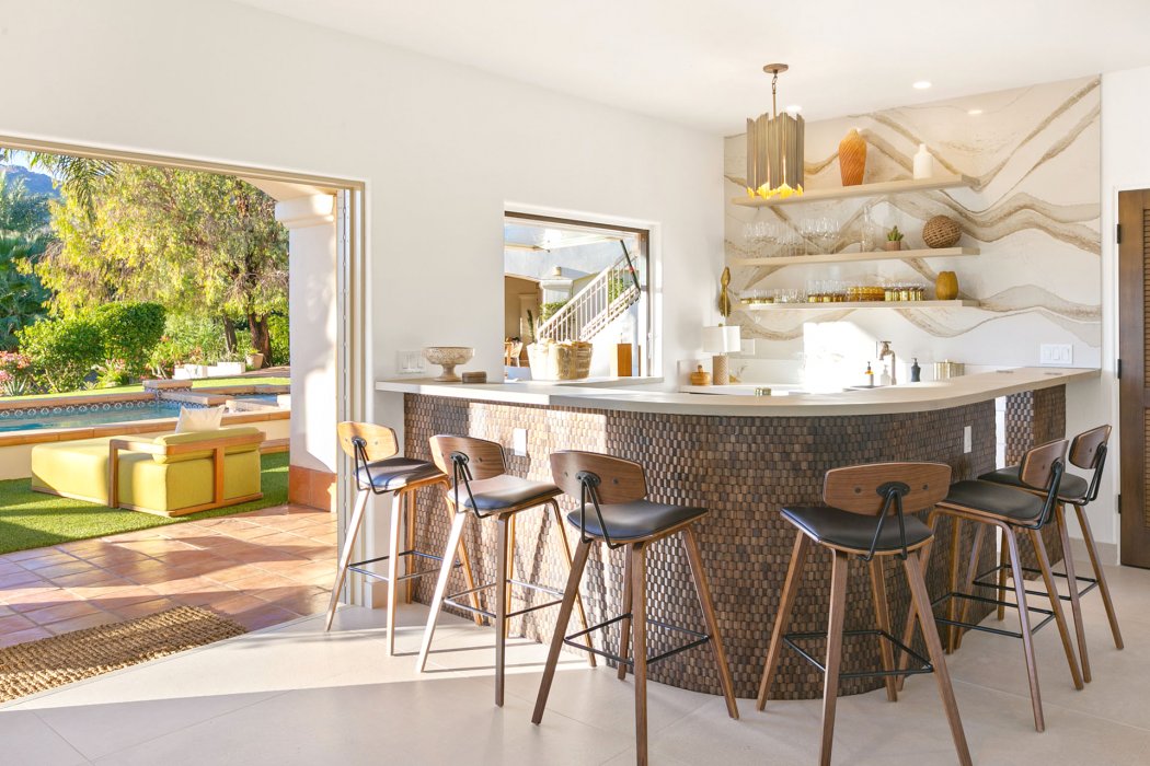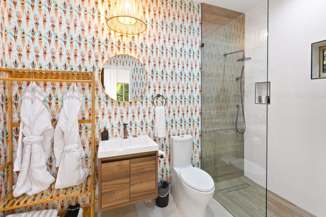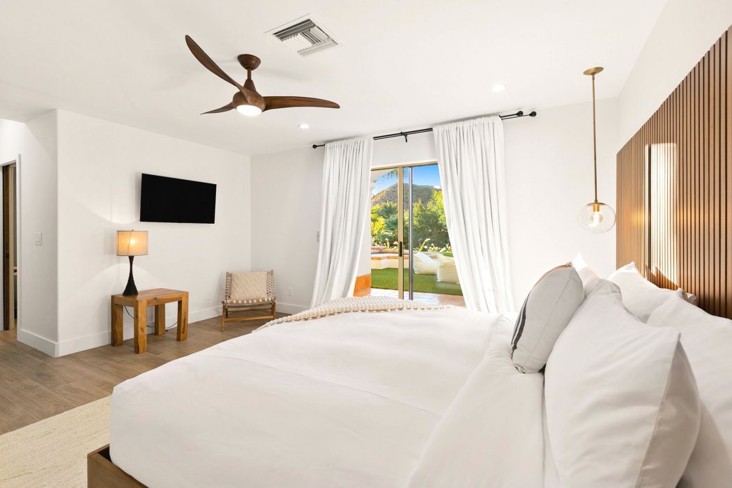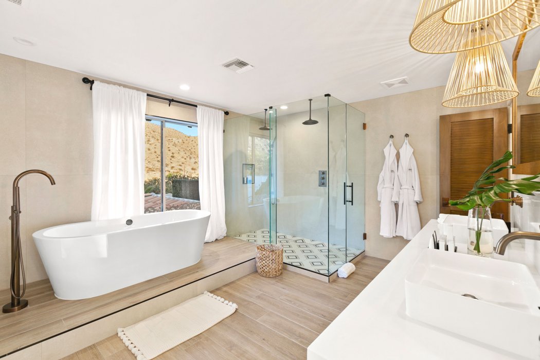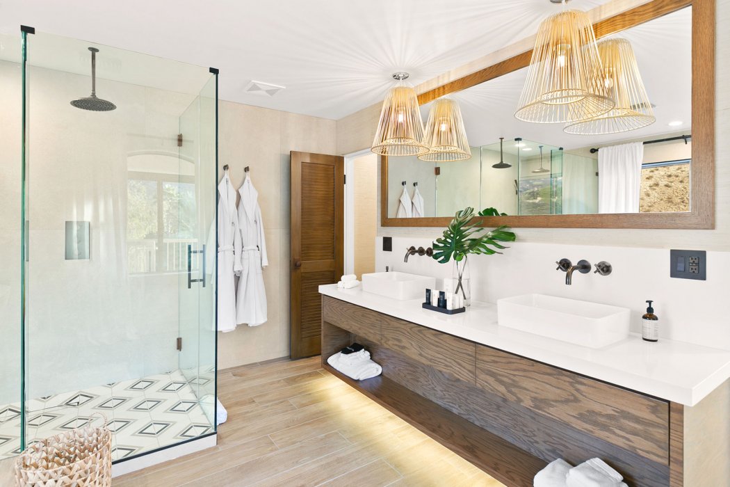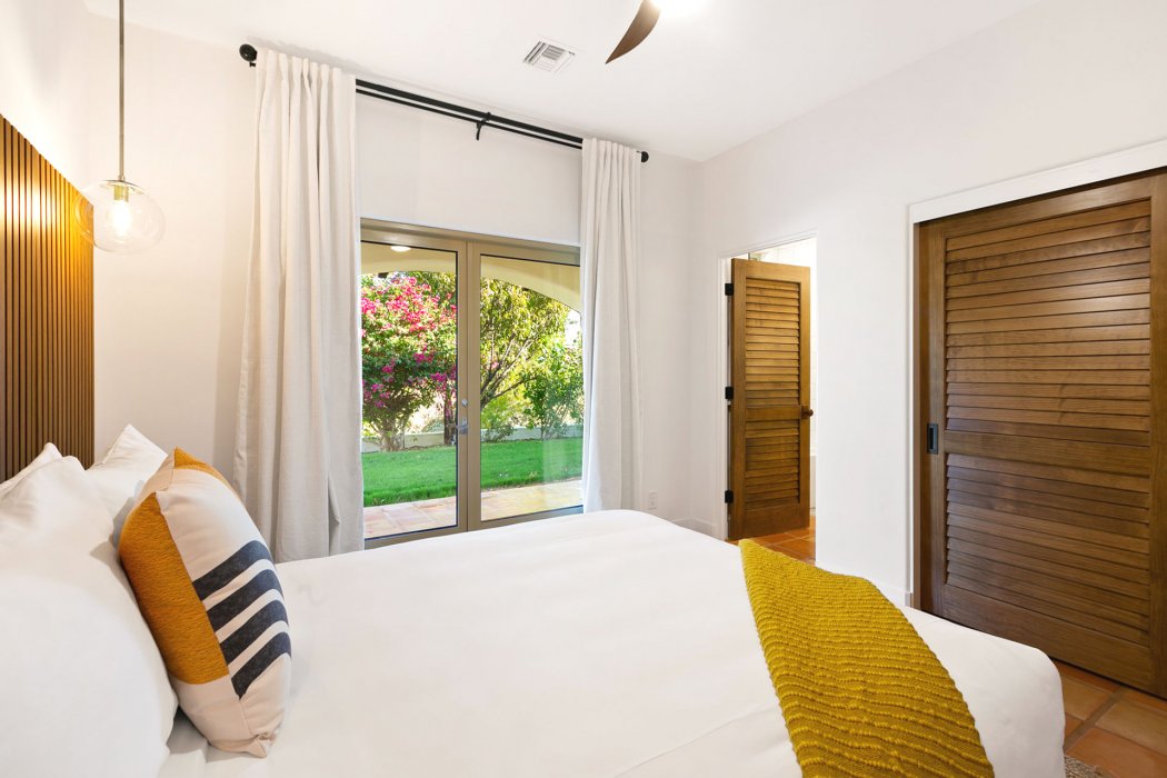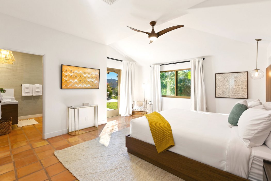 Indoor living is spread across three buildings. The Villa, Bungalow, and Casita buildings. The Villa contains the King Master Suite and two more King ensuite bedrooms. The Master Suite features a King bed, sitting area with TV, gas fireplace, walk in closet with washer and dryer. French doors to the terrace which overlooks the pool, pond and out to the mountains. The en suite bathroom is simply stunning, with a soaking tub and shower with dual rainfall shower heads. The other 2 Villa Suites have private entrances and King beds, flatscreen TVs and en suite bathrooms.